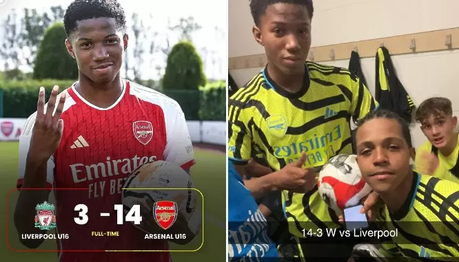 Bocah 15 tahun milik akademi Arsenal, Chido Obi-Martin mencetak 10 gol saat Arsenal U16 mengalahkan Liverpool U16 dgn skor 14-3 ????