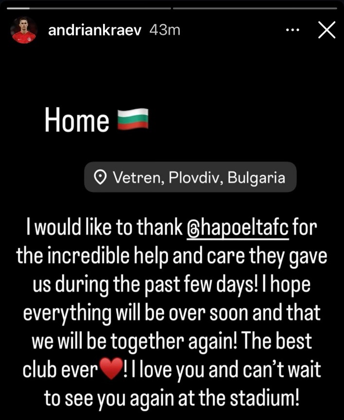 „У дома. Искам да благодаря на Апоел Тел Авив за невероятната помощ и грижа, които ни оказаха в последните дни. Надявам се всичко да приключи скоро и да сме заедно отново. Най-добрият клуб някога! Обичам ви и нямам търпение да се видим отново на стадиона“, написа Андриан Краев.