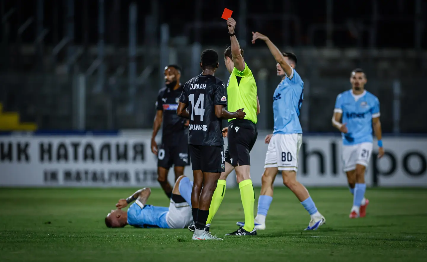 Изоставането в резултата и брага в играта изнерви гостите и в 34-ата минута Дивин Наа направи много грубо нарушение в средата на терена, стъпвайки върху глезена на Серкан Юсеин и съдията го изгони с директен червен картон, а медицинските лица влязоха, за да помогнат на халфа на Арда!