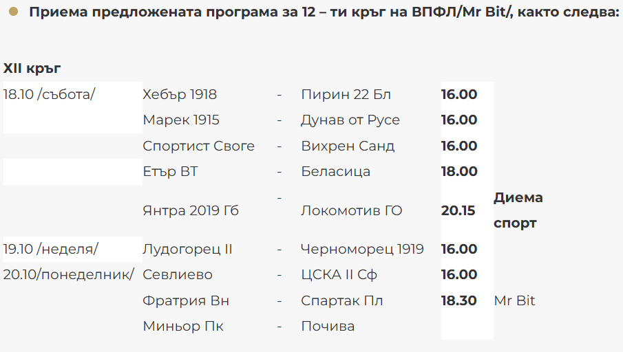 Програма за всички мачове от 12-ия кръг на Втора лига: