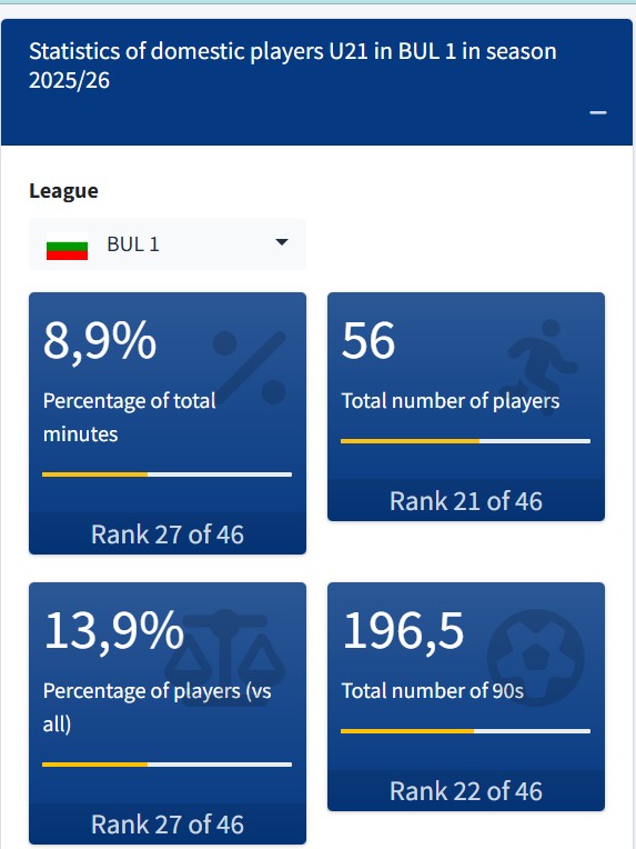 Българската Първа лига е в средата на класициите в Европа на база футболисти между 16 и 21 години, които играят в елитната дивизия този сезон. Според статистиката 8,9% от изиграните минути от началото на сезона в българското първенство се падат на тези футболисти, което означава, че по този показател България се намира на 27-о място от 46 лиги. В класацията обаче влизат не само елитни дивизии, но и такива от второто ниво на футбола в държави членки на Асоциацията на европейските лиги.
