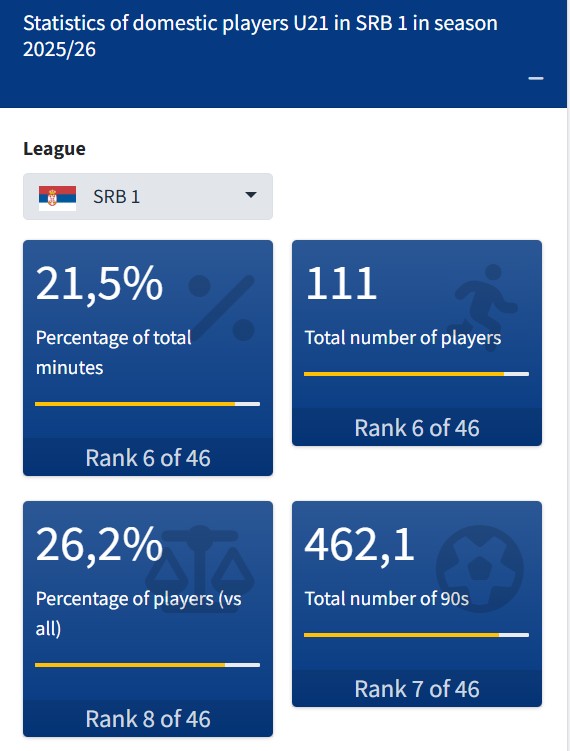 На първо място в класацията е втора дивизия на Нидерландия, в която 29,9% от футболистите са местни до 21 години. Следват вторите нива на Сърбия, Австрия, Белгия и Северна Ирландия. Изненадващо или не на първо място сред елитните дивизии по този показател е Сърбия - 21,5% местни футболисти до 21 години. След това са Уелс и Дания съответно с 15,2% и 14,3%. Ако отчетем само елитните дивизии България е на 11-о място, като дели тази позиция с Белгия и Израел. Цели 16 елитни дивизии от Европа са под България, като в това число влизат и топ 5 първенствата.