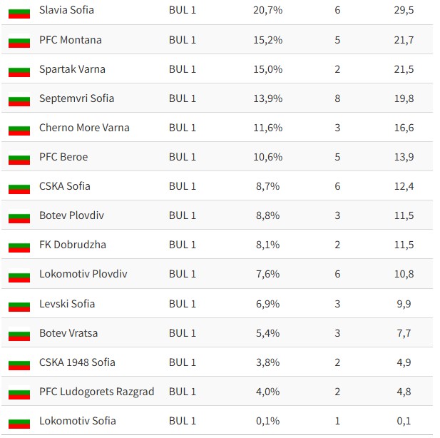 Най-сериозен процент на минути за футболисти под 21 години дава Славия – 20,7%, а на второ място е Монтана с 15,2. 15% е и за Спартак Варна. По този показател на последно място е Локомотив София, а на предпоследно Лудогорец.