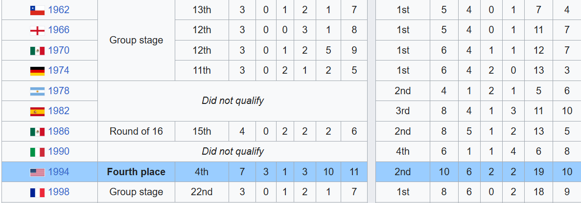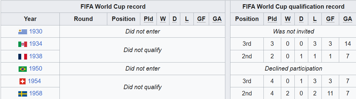 България не участва в квалификациите за Мондиалите през 1930 и 1950 година, а единствените си квалификации без дори равенство записва за Италия 1934. Тогава обаче мачовете са едва три, колкото са и загубите, при голова разлика 3:14.