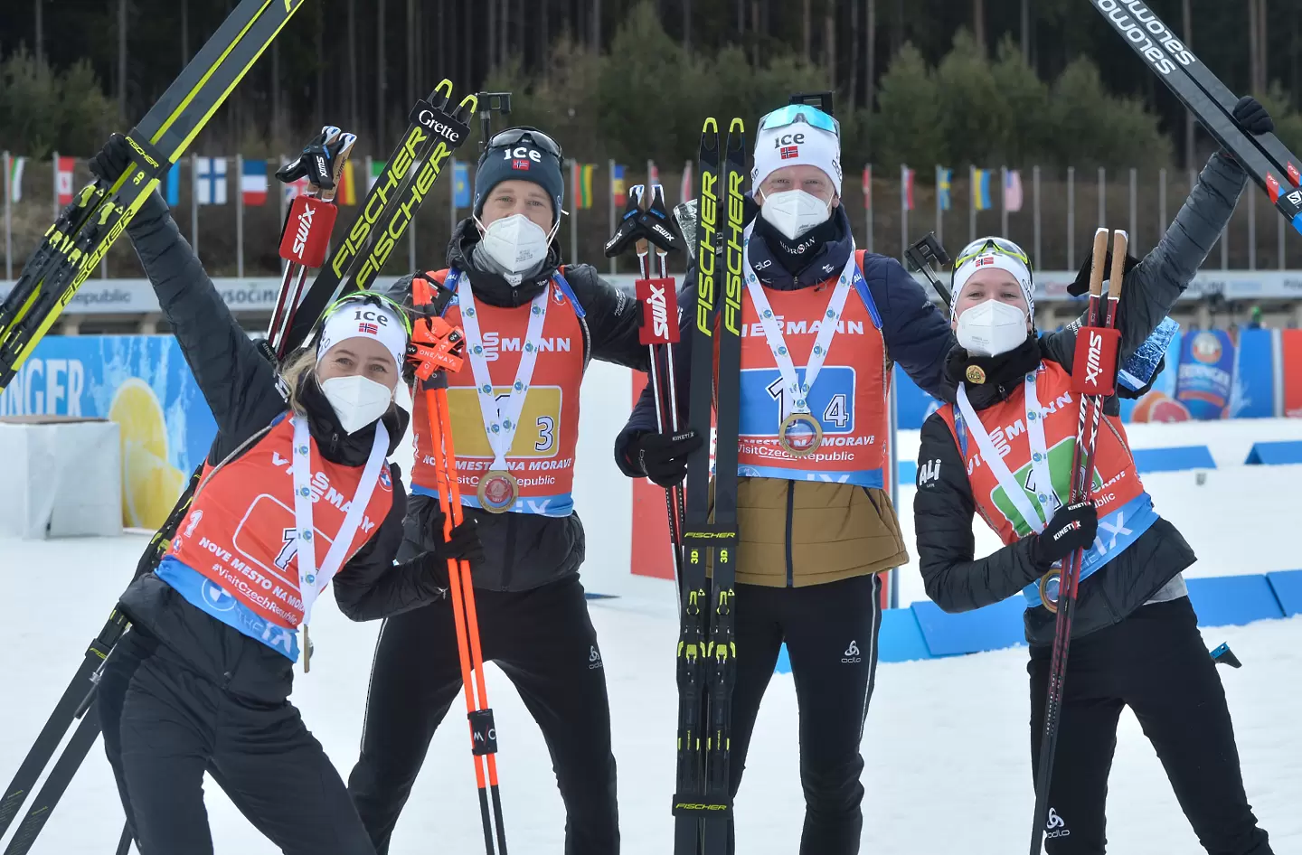 Световният шампион Норвегия спечели последната за сезона смесена щафета на 4 по 6 км от Световната купа по биатлон в чешкия зимен център Нове Место.