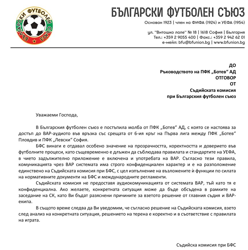 Съдийската комисия към Българския футболен съюз отказа да предостави записа от комуникацията между съдиите на терен и тези във ВАР-буса от мача между Ботев Пловдив и Левски, обявиха „жълто-черните“.