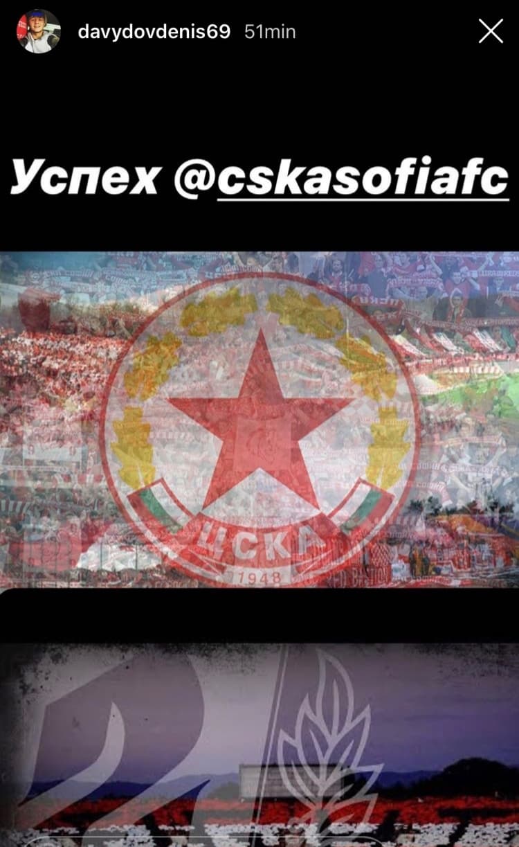 Бившият футболист на ЦСКА Денис Давидов пожела успех на "червените" във финала за Купата на България срещу Локомотив Пловдив, като използва за това профила си в Instagram.