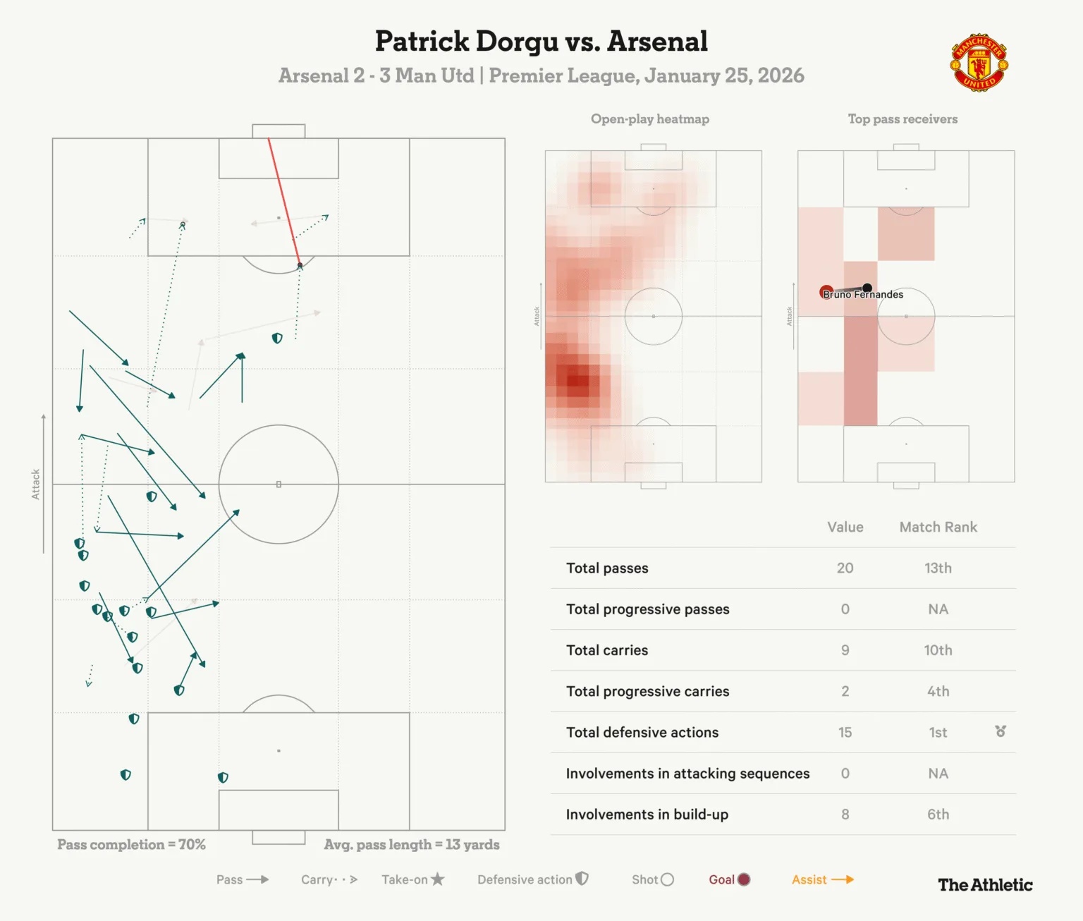 Решението за Доргу беше брилянтно. Карик знаеше, че Букайо Сака е най-голямата заплаха. С поставянето на Доргу пред Люк Шоу, Юнайтед получи „дублиран“ дефанзивен блок по този фланг. Доргу не само неутрализира Сака, но със своята физическа мощ беше ключов за изнасянето на топката от собствената половина.