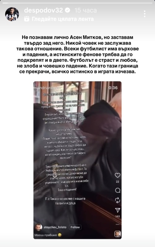"Не познавам лично Асен Митков, но заставам твърдо зад него. Никой човек не заслужава такова отношение. Всеки футболист има върхове и падения, а истинските фенове трябва да го подкрепят и в двете. Футболът е страст и любов, не злоба и човешко падение. Когато тази граница се прекрачи, всичко истинско в играта изчезва", написа Десподов в Instagram.