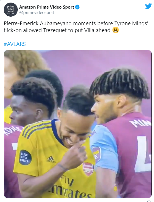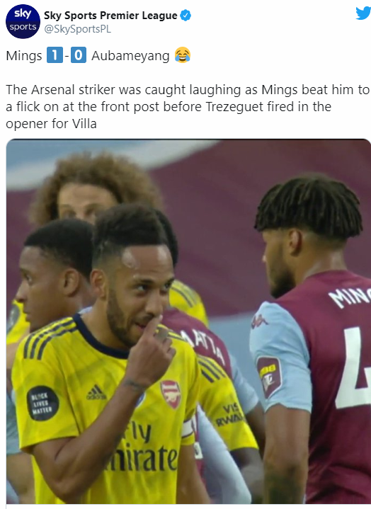 В социалните мрежи обаче се разпространиха снимки, които показват как Обамеянг се смее на шега, която явно Мингс е пуснал преди изпълнението на ъгловия удар. Именно нападателят на Арсенал трябваше да скача с централния бранител на Вила и след изпълнението го "забрави".