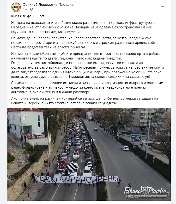 Феновете на Локомотив Пловдив използваха социалните мрежи, за да изразят недоволството си от решенията на местната власт и в частност кмета на града Здравко Димитров. Според привържениците на „смърфовете“ има различен аршин, който местните представители на властта прилагат спрямо двата най-големи пловдивски отбора – Локомотив и Ботев.