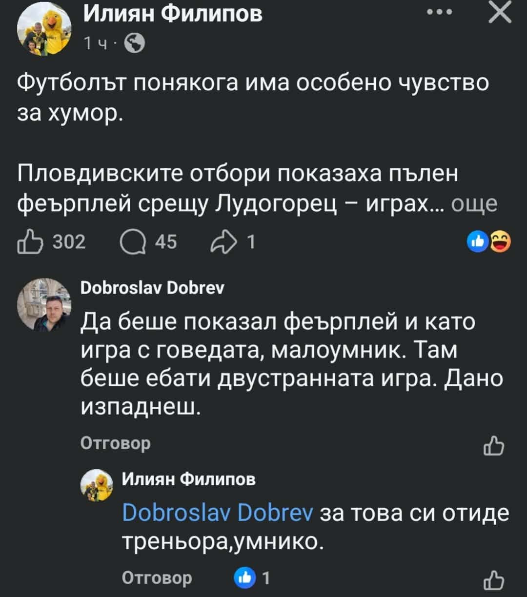 „Да беше показал феърплей и като игра с говедата, малоумник. Там беше ебати двустранната игра. Дано изпаднеш“, гласи коментар под поста на Филипов, на който босът на Ботев Пловдив отговори лаконично: „За това си отиде треньорът, умнико“, визирайки раздялата с Херо ден след мача със "сините".