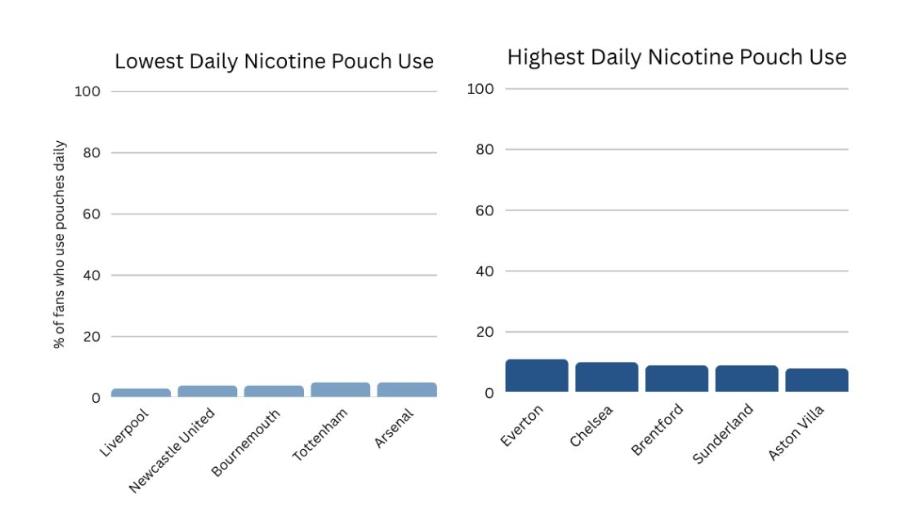 Употребата на никотинови паучове също все по-често се свързва с футболната култура, като проучването отчита значително по-високи нива сред феновете в сравнение с общото население. Най-висок дял на ежедневна употреба се наблюдава при привържениците на Евертън (11%), следвани от Челси (10%) и Брентфорд (9%), на фона на едва 1.1% сред възрастните във Великобритания.