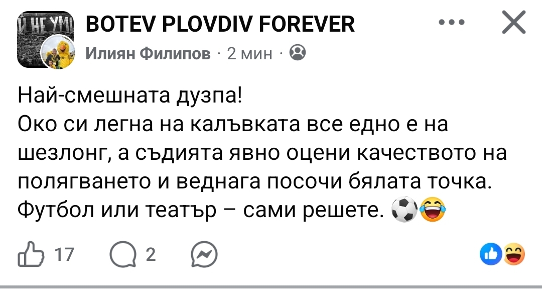 Футбол или театър – сами решете“, написа Филипов в една от големите Facebook групи с привърженици на Ботев Пловдив.