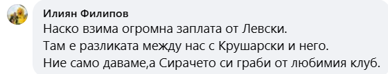 „Наско взима огромна заплата от Левски. Там е разликата между нас с Крушарски и него. Ние само даваме, а Сирачето си граби от любимия клуб“, гласи друг коментар на Илиян Филипов.