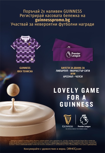 С нова активация GUINNESS потапя в предпразнична атмосфера българските фенове на най-гледаното футболно първенство в света – Висшата лига. От 14 ноември до 31 декември в избрани заведения в страната ирландският стаут дава възможност за страхотни награди на всеки любител на първокласния клубен футбол, закупил 2 наливни GUINNESS-а. Наградите включват специална лимитирана тениска и два двойни билета за емблематични мачове от Английската висша лига.