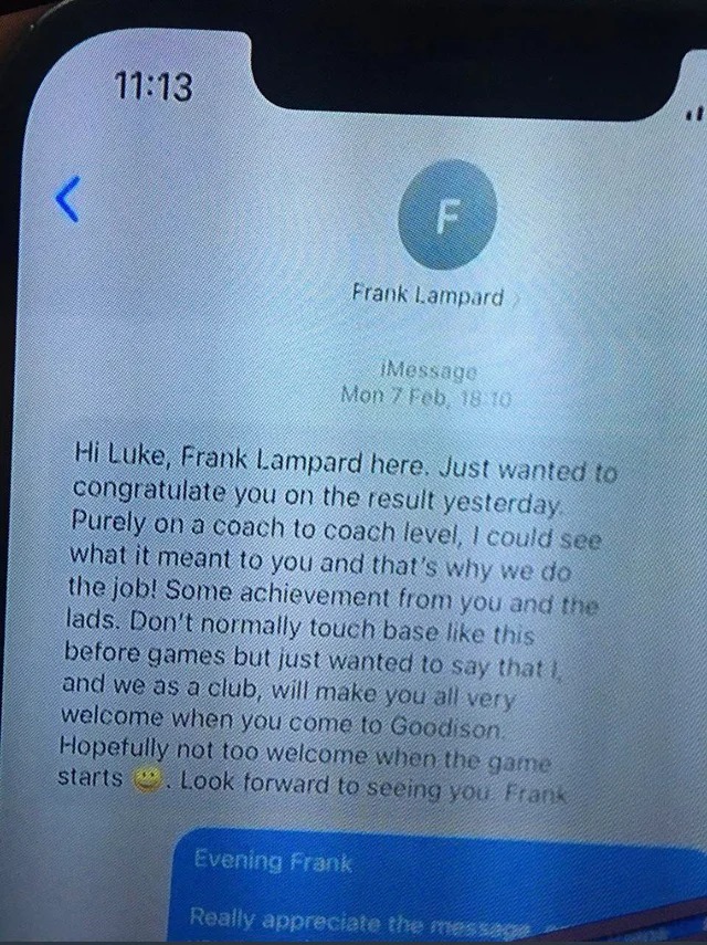 „Здравей, Люк. Франк Лампард е. Исках да те поздравя за постигнатия резултат вчера (победата срещу Борнемут). Като треньор виждам колко много значеше за теб тази победа. Определено голямо постижение за теб и футболистите. По принцип не пиша подобни съобщения преди мач, но просто искам да те уверя, че всички в клуба ще ви посрещнем много добре на „Гудисън“. Да се надяваме, че няма да се чувствате толкова добре посрещнати след началото на мача. Нямам търпение да се видим! Франк“, написа Лампард към своя колега.