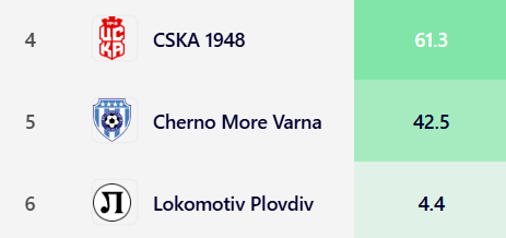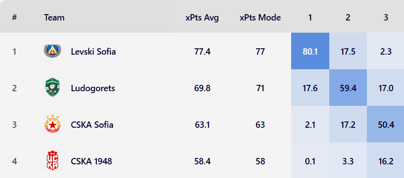Шансовете на разградчани да грабнат рекордна 15-а поредна титла се сринаха до едва 17.6%. Триумф на ЦСКА е оценен на 2.1%. Минимални шансове се дават още на ЦСКА 1948 и Черно море, които ще водят здрава битка с Локомотив Пловдив за място в топ 4.
