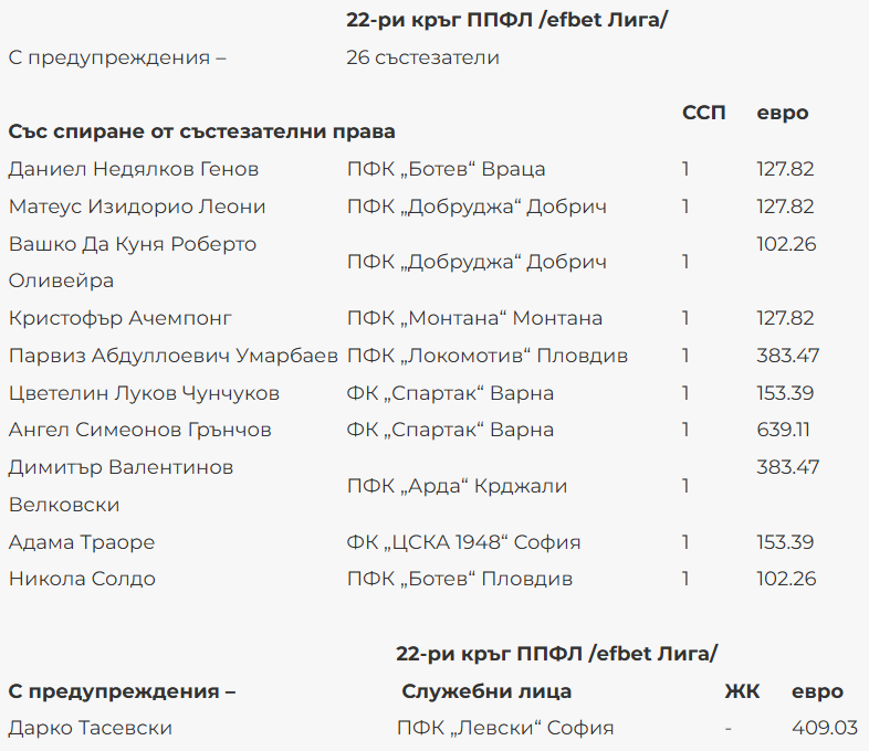 Дисциплинарната комисия към Българския футболен съюз определи наказанията след 22-рия кръг в Първа лига. Общата сума на глобите е 6 237.76 евро. Най-голямо е наказанието на Левски - 2198.55 евро, а най-малко – на ЦСКА (159.39).