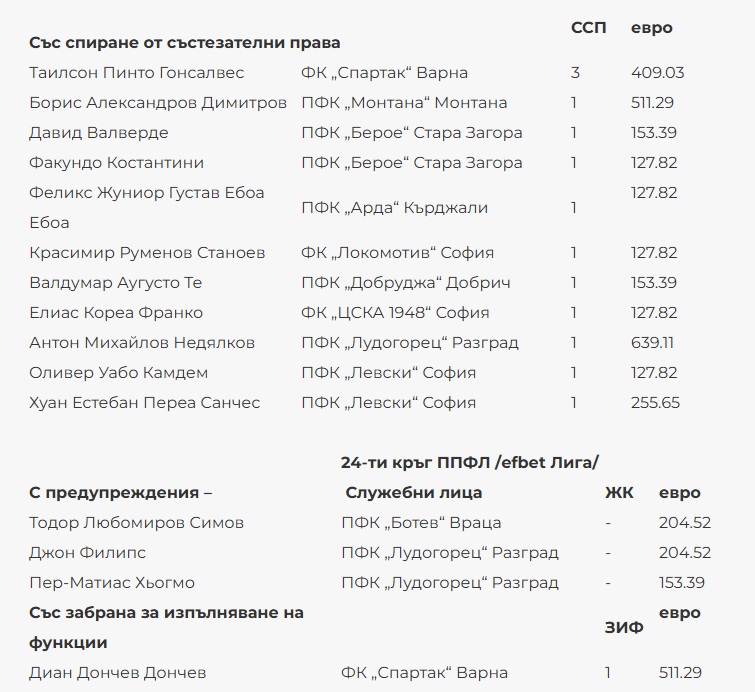 Левски е с най-сериозна финансова санкция след междинния 24-ти кръг на първенството. От Дисплинарната комисия към Българския футболен съюз обявиха наказанията и глобите, а "сините" са глобени с общо 4755.01 евро за различни провинения на феновете им по време на мача с Лудогорец, като са задължени и да покрият щетите по стадион "Хювефарма Арена".