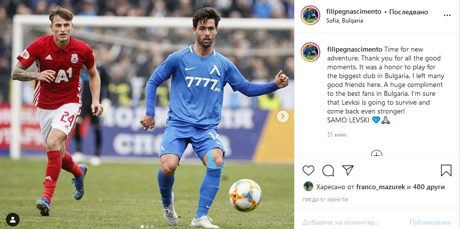 Филипе Нашименто вече е бивш футболист на Левски. Халфът написа емоционално съобщение в своя профил в Instagram. В него той написа, че вярва, че "сините" ще оцелеят.