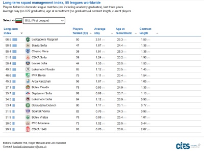 Ново проучване на CIES (Център за футболна обсерватория) представя глобална класация на клубовете, чието управление на отбора е най-фокусирано върху дългосрочния план, базирана на индекс, комбиниращ четири показателя: броя на играчите, използвани в мачове от лигата през последните три години (колкото по-нисък, толкова по-добре), средния престой на настоящите играчи в първия отбор, средната оставаща продължителност на договорите на същите тези играчи и средната им възраст към момента на подписване (колкото по-нисък, толкова по-добре). Реал Мадрид постигна най-висок резултат, което отразява стратегия за привличане на млади играчи и задържането им в дългосрочен план. Грандът от Мадрид е пред Брентфорд и Атлетик Билбао. Що се отнася до България – Лудогорец постига най-висок резултат.