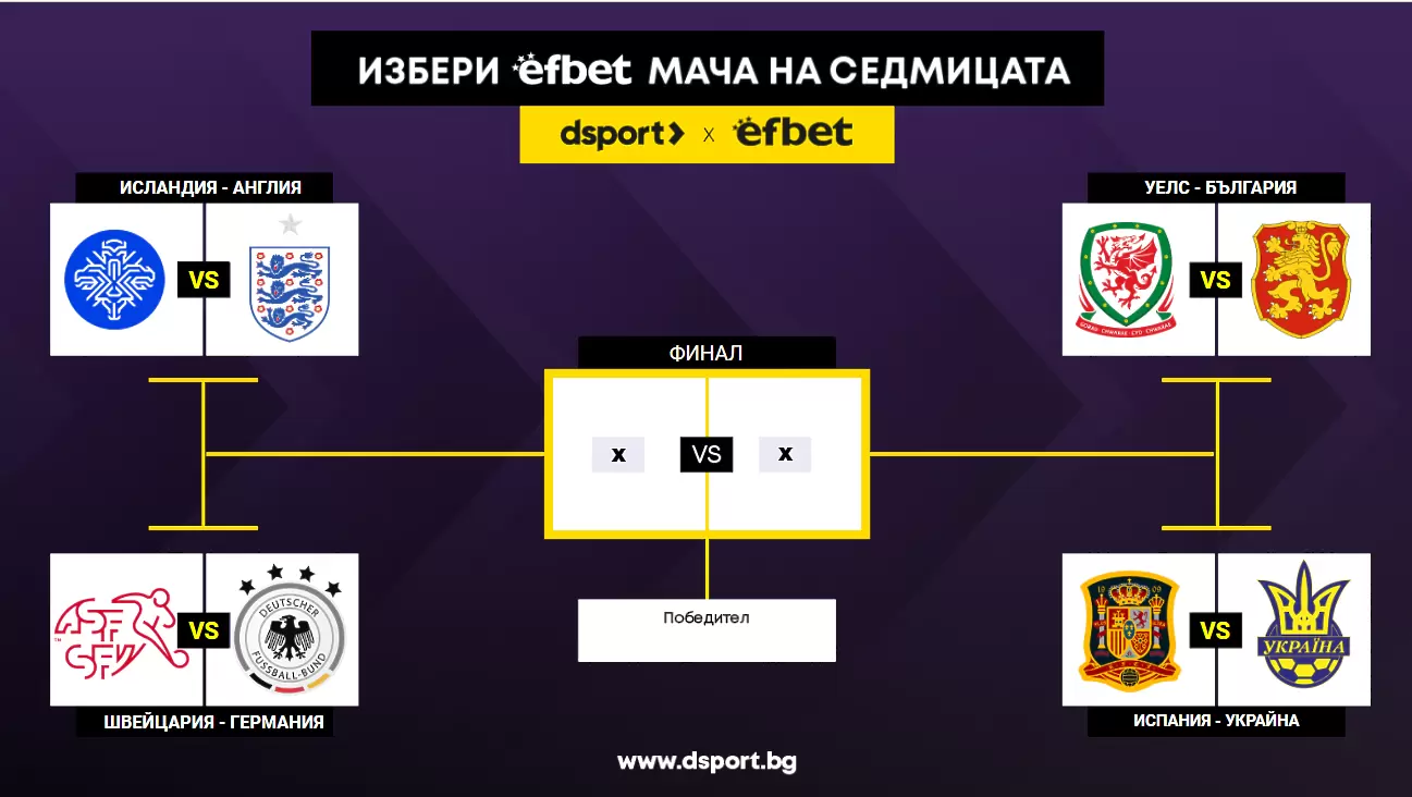 В седмицата, в която се завръщат мачовете на националните отбори, е време на проверим дали мачът на националния ни тим срещу Уелс или пък двубоите на големите европейски колоси ще предизвикат по-голям интерес. Традиционно dsport и efbet търсят най-интересния мач на уикенда, а тази седмица са двубоите от Лигата на нациите.