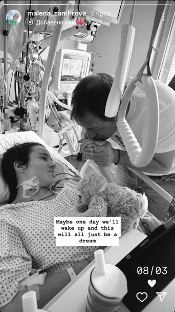 Снимката е от 8 март в болницата, където 16-годишната ни състезателка бе оперирана след тежка катастрофа в началото на март. На фотоса са лежащата в леглото Малена и нейният баща - Анатолий Замфиров.