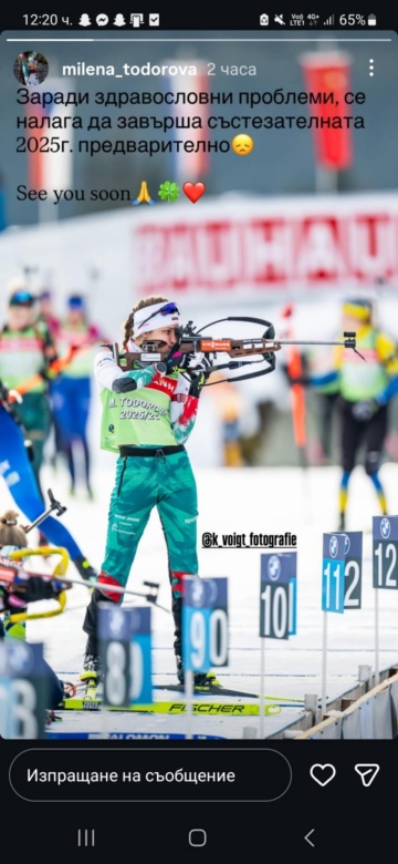 Българската биатлонистка Милена Тодорова пропусна днешното преследване поради здравословни проблеми.