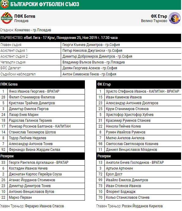 Резерви: 33. Георги Аргилашки, 6. Костадин Ничев, 2. Джонатан Перейра, 26. Атанас Стоименов, 23. Димитър Тонев, 10. Антонио Вутов, 22. Марко Перван
