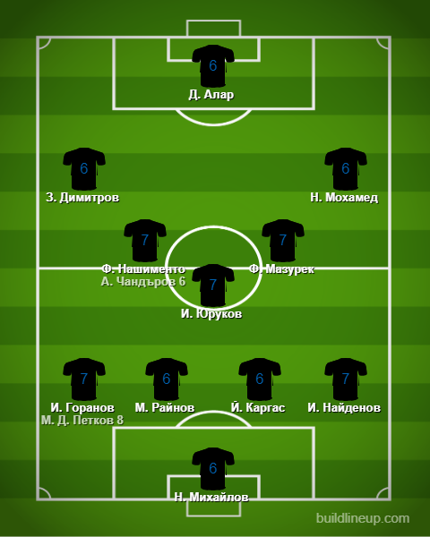 Резерви: 12. Петър Иванов, 20. Живко Миланов, 79. Мартин Петков, 17. Найджъл Робърта, 99. Станислав Иванов, 23. Хали Тиам, 21. Асен Чандъров