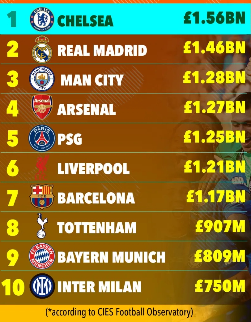 След това е Тотнъм, осми в световен мащаб с отбор под ръководството на Томас Франк на стойност 907 милиона паунда, а Байерн Мюнхен и Интер допълват челната десетка.