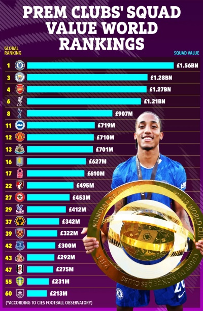 Това е с около 100 милиона паунда повече от втория Реал Мадрид в класацията, в която има седем отбора от Висшата лига в топ 12.