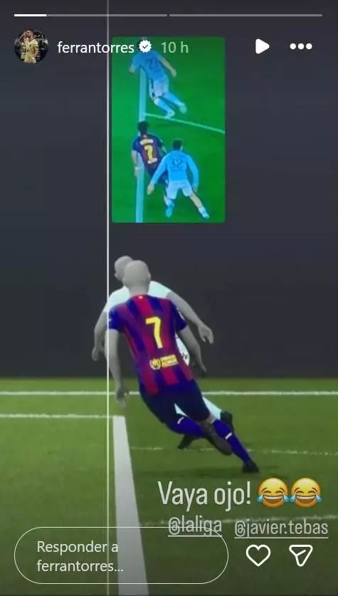 Феран Торес използва ирония и отправи остър закачлив коментар. Той написа под снимката: „Какво око!“. Той директно спомена историите на Ла Лига и Хавиер Тебас, въпреки че VAR и съдийството се управляват от CTA (Технически комитет на съдиите) и Федерацията. На втората екранна снимка, от мача срещу Еспаньол, той показа линиите, начертани до GIF на съдия, показващ засада.