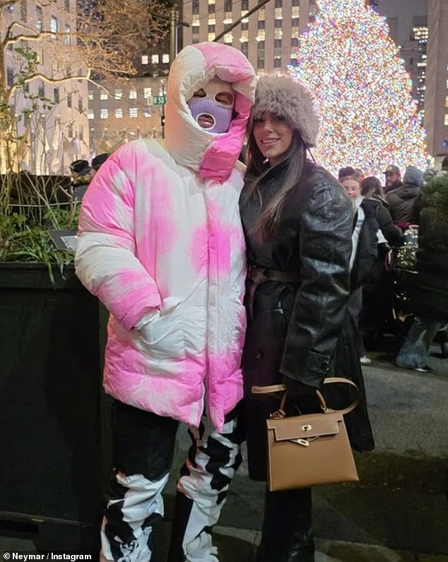 Неймар бе облечен с екстравагантно розово-бяло палто на Louis Vuitton, за което се смята, че се продава за малко под £4500. Той позира за няколко празнични снимки с партньорката си, докато двамата се наслаждаваха на коледната атмосфера.