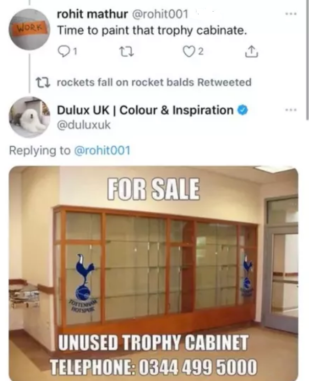 От новия спонсор на Тотнъм отвърнаха на предложението със снимка на изфабрикувана обява за продажба на въпросната витрина, защото е ненужна. По-късно констатираха пред запалянко, че преди боядисване повърхността винаги би следвало да е чиста, а не да е покрита с прах.