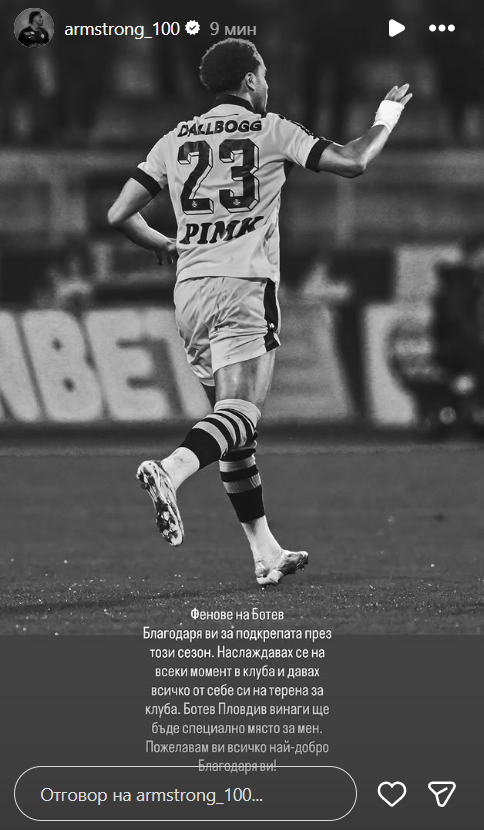 Новото крило на Левски Армстронг Око-Флекс се сбогува с Ботев Пловдив след трансфера си на „Герена“ чрез стори в Instagram.