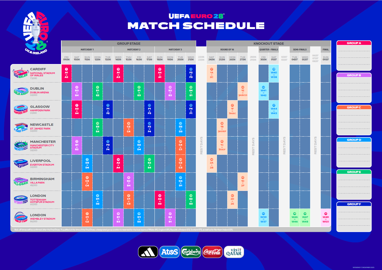 Шампионатът ще започне на 9 юни 2028 г. с мач на Националния стадион на Уелс в Кардиф и ще приключи с големия финал на Уембли в Лондон на 9 юли 2028 г.