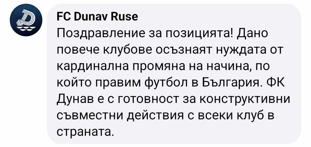 "Поздравление за позицията! Дано повече клубове осъзнаят нуждата от кардинална промяна на начина, по който правим футбол в България. ФК Дунав е с готовност за конструктивни съвместни действия с всеки клуб в страната."
