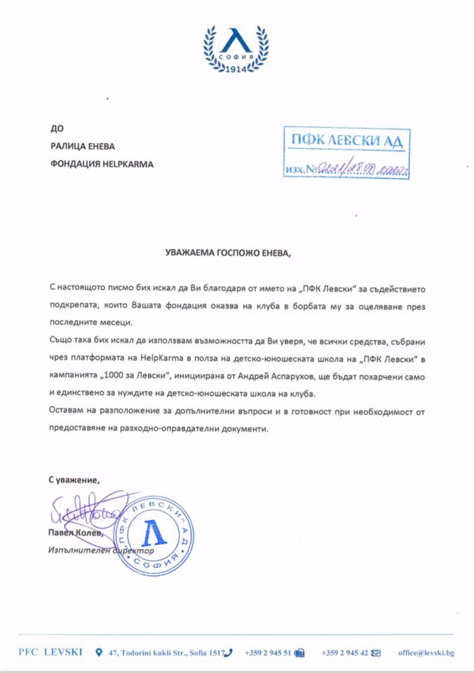 Преди месец Андрей инициира кампания в платформата HelpKarma, целяща да събере 1000 фенове на тима, които чрез месечен абонамент от $20 да подпомагат школата на Левски.