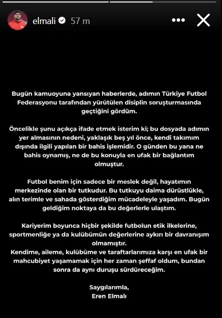 „Футболът за мен не е просто професия, а страст, която е в основата на живота ми. Винаги съм живял тази страст с честност, пот и борбен дух на терена. Стигнах до мястото, където съм днес, с тези ценности. През цялата си кариера никога не съм се държал по никакъв начин в противоречие с етичните принципи на футбола, духа на спортсменството или ценностите на моя клуб. Винаги съм бил прозрачен, за да не изпитвам и най-малък срам пред себе си, семейството си, моя клуб и нашите фенове, и ще продължа да поддържам същата позиция. С най-добри пожелания, Ерен“, добави той.