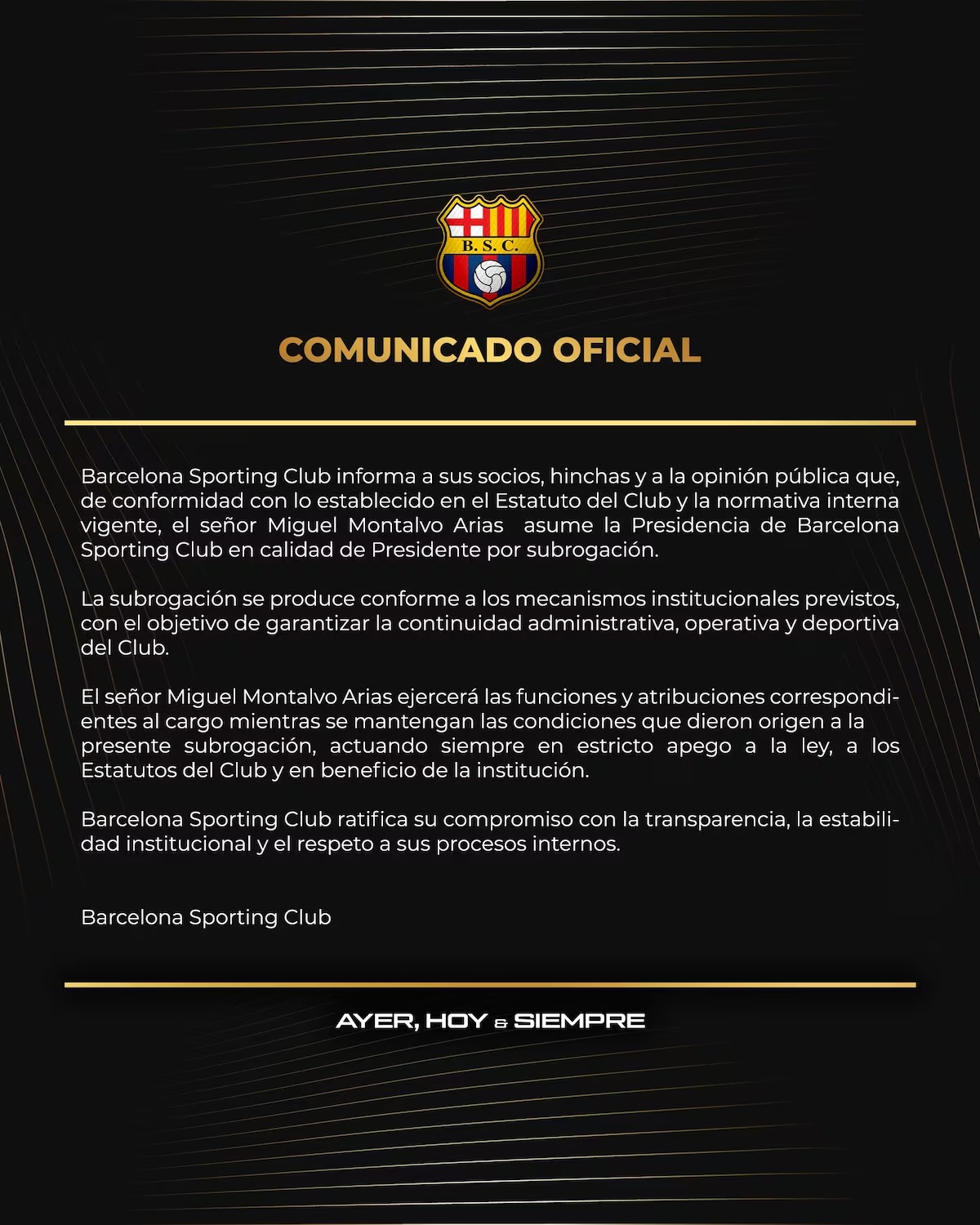Вследствие на разследването, ръководството на клуба от Гуаякил незабавно отстрани Алварес от президентския пост. В официално съобщение от Барселона СК обявиха, че Мигел Монталво Ариас поема управлението като временно изпълняващ длъжността президент. Целта е да се „гарантира административната, оперативната и спортната приемственост“ в този труден за клуба момент.