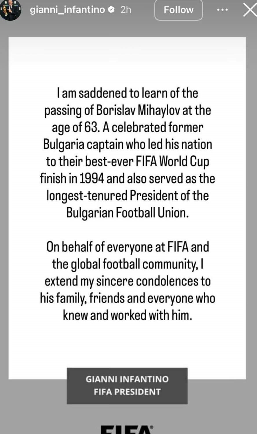 „С тъга научих за кончината на Борислав Михайлов на 63-годишна възраст. Изявен бивш капитан на България, който изведе националния отбор до най-доброто им класиране на Световно първенство на ФИФА през 1994 г., и също така беше най-дълго заемалият поста президент на Българския футболен съюз“.
