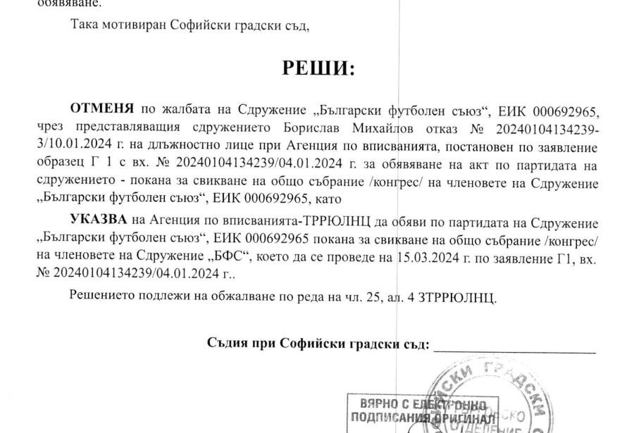 “Отменя по жалба на БФС отказ на длъжностно лице при Агенцията по вписвания, постановен по заявление за обяввяване на акт по партидата на сдружението - покана за свикване на общо събрание (конгрес) на членове на БФС. Указва на Агенцията по вписвания да обяви партидата на БФС покана за свикване на конгрес, който да се проведе на 15.03.2024 година”, се казва в решението на съда, което значи, че към този момент конгрес на 15 март 2024 година ще има.