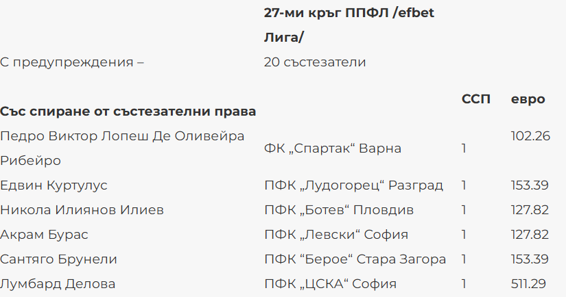 Дисциплинарната комисия към БФС санкционира само пет отбора (Левски, Спартак Варна, Локомотив София, Локомотив Пловдив, Ботев Враца) след 27-ия кръг в Първа лига.