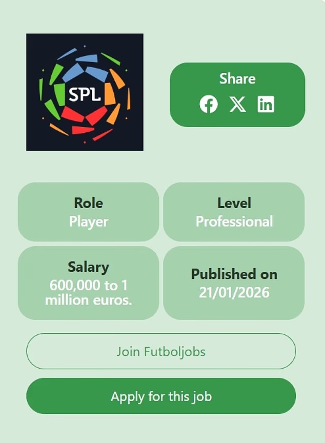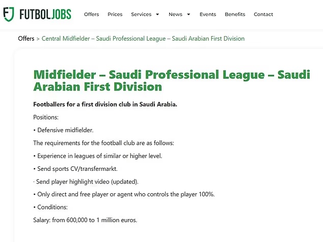 Обявата, публикувана в испанския сайт Futboljobs, е насочена към футболист с подходящ опит, на когото се предлага годишна заплата в размер до £875 000. Като работодател е посочена Саудитската професионална лига, чието лого се вижда на уеб страницата, заедно с изискванията към потенциалните кандидати.