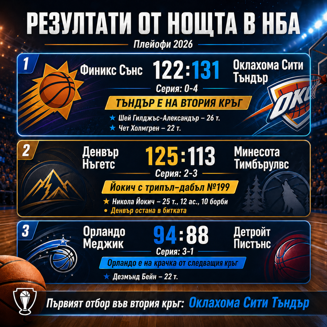 Звездата на вечерта отново бе Шей Гилджъс-Александър, който приключи срещата с 26 точки. Силно включване добави и младата надежда Чет Холмгрен с 22 пункта. Оклахома, водена от Марк Дейно, показа шампионска зрялост и чака победителя от двойката ЛА Лейкърс – Хюстън Рокетс за следващата фаза. Припомняме, че Тъндър защитават титлата си от 2025 г., когато победиха Индиана в епичен финал.