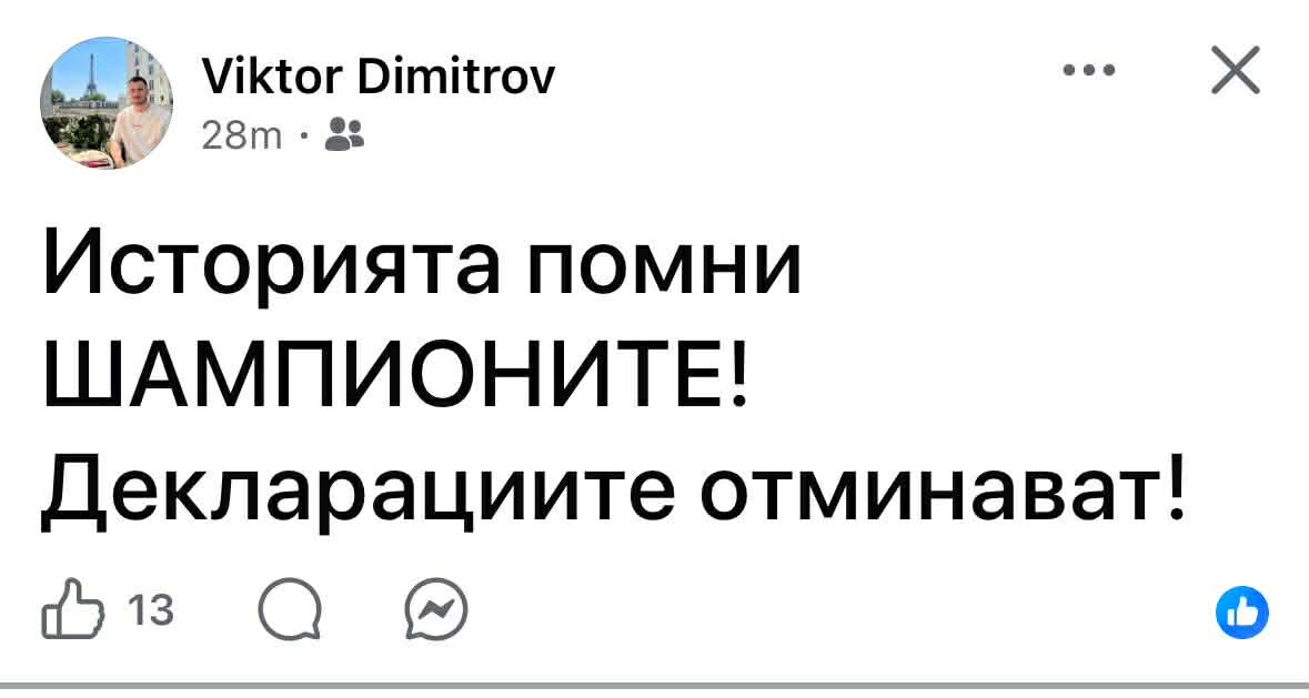 „Историята помни ШАМПИОНИТЕ! Декларациите отминават!“, написа в профила си във Facebook синът на Херо.