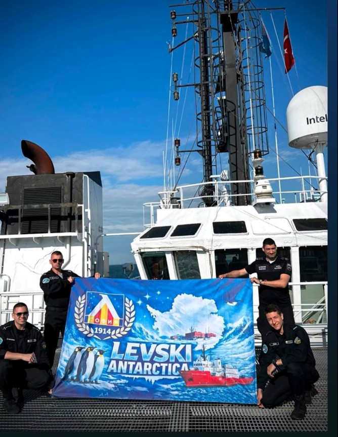 Българският научно-изследователски кораб „Св. св. Кирил и Методий“ се прибира в четвъртък в България и се очаква да акостира на пристанище Варна. С него се прибират и участниците в 34-тата Българска антарктическа експедиция. Част от тях се оказаха и привърженици на водача в класирането Левски. Те разпространиха снимка в социалните мрежи на знаме, на което е изобразена емблемата на клуба, надпис „Levski Antarctica“, няколко пингвина и самият остров Ливингстън, където е българската антарктическа база.