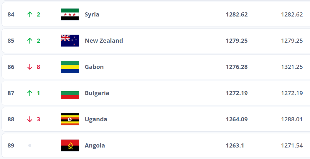 “Лъвовете” прогресират без да са играли от последното обновяване на ранглистата, като вече се намират на 87-о място, изпреварвайки Уганда, който направи едно равенство и две загуби и отпадна в групите на турнира в Мароко, спечелен от Сенегал.